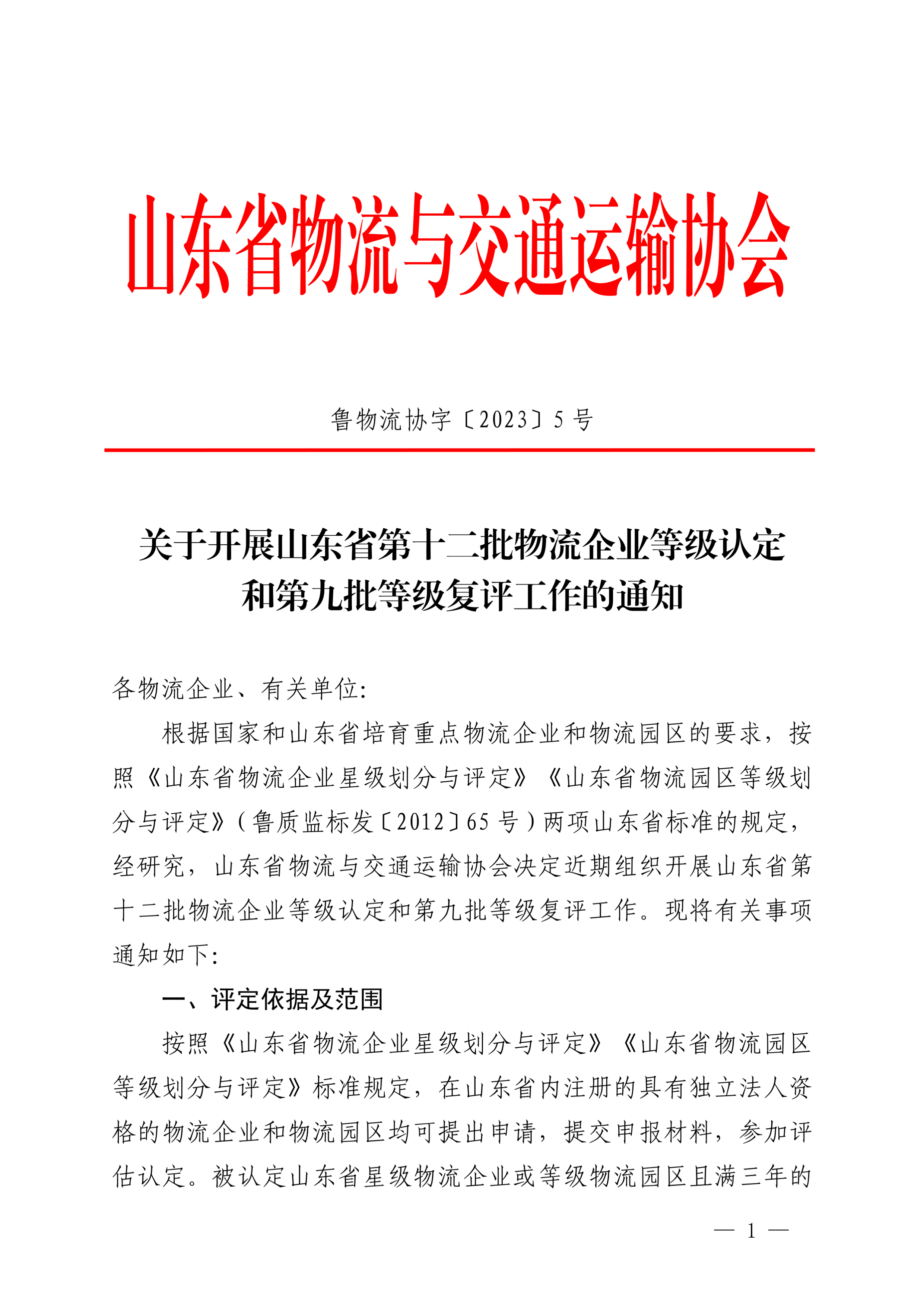 关于开展山东省第十二批物流企业等级认定和第九批等级复评工作的通知