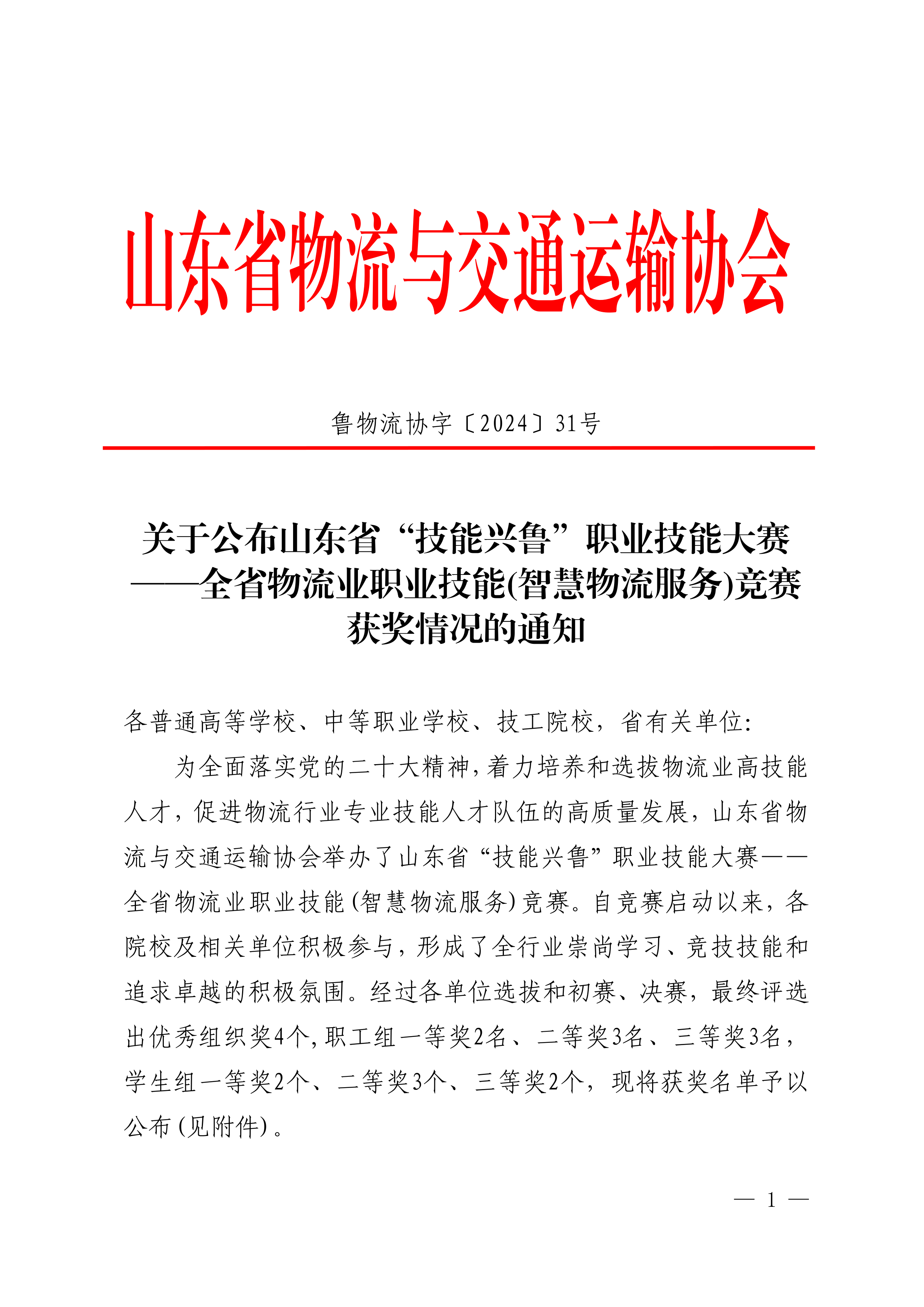 山东省“技能兴鲁”职业技能大赛—全省物流业职业技能(智慧物流服务)竞赛获奖情况的通知