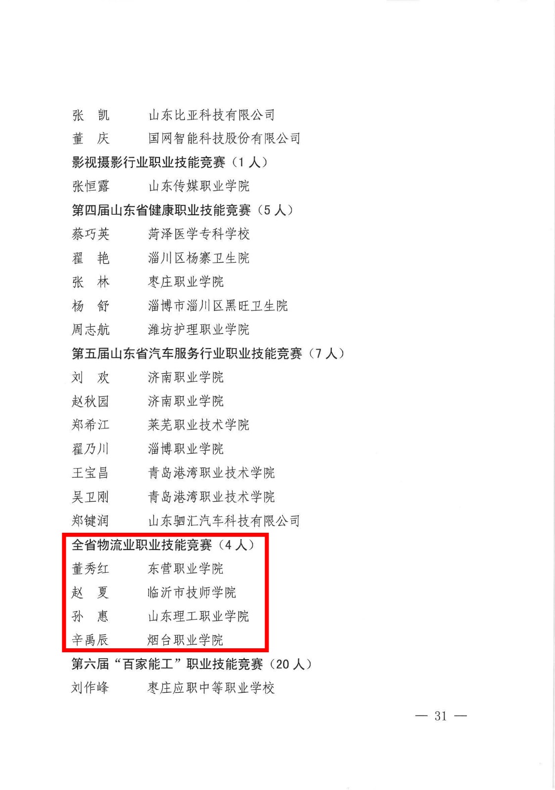 山东省人力资源和社会保障厅印发了《关于公布2024年度“山东省技术能手”名单的通知》,山东省物流与交通运输协会主办的2024年山东省“技能兴鲁”职业技能大赛——全省物流业职业技能竞赛中,东营职业学院数字财金与管理学院董秀红、临沂市技师学院商务管理系赵夏、山东理工职业学院商学院孙惠、烟台职业学院经济贸易系辛禹辰四名教师分别在快递运营、智能仓储规划设计、供应链运营、智慧物流服务赛项中表现出色,获得各赛项职工组第一名,被授予2024年“山东省技术能手”称号并按规定发放证书和奖金。